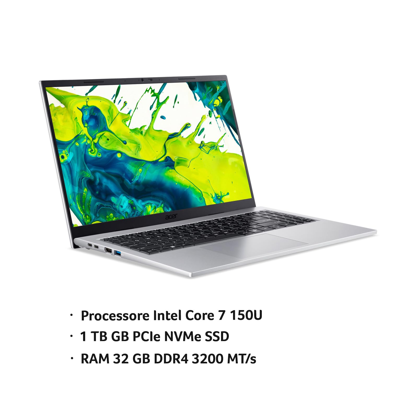 acer Aspire Go 15 AG15-72P-78E4 PC Portatile, Notebook, Processore Intel Core 7 150U, RAM 32 GB DDR4, 1024 GB PCIe NVMe SSD, Display 15.6" FHD, Scheda Grafica Intel Graphics, Windows 11 Home — Memory Speed: 3200, Processor Count: 1, Power Plug Type: type_l_3pin_it, Total Hdmi Ports: 1. Spedizione gr