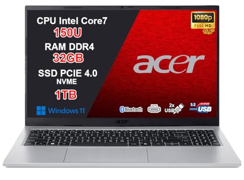 acer Aspire Go 15 PC Portatile Notebook, CPU Intel Core 7 150U di nuova generazione fino a 5,4 GHz, RAM 32GB, SSD 1TB, Wi-Fi 6, Display 15,6" Full HD Antiriflesso, USB Type-C, Windows 11, Silver — Memory Speed: 3200, Processor Count: 12, Total Thunderbolt Ports: 2, Power Plug Type: type_l_3pin_it. S
