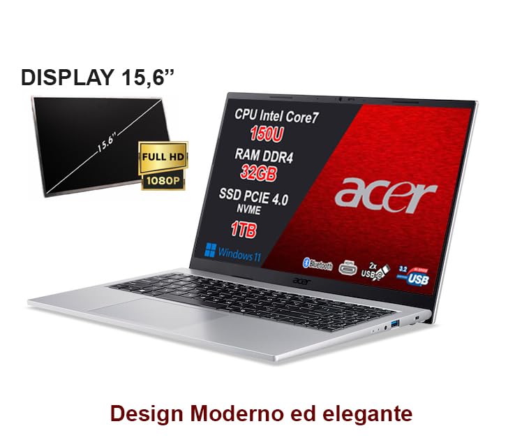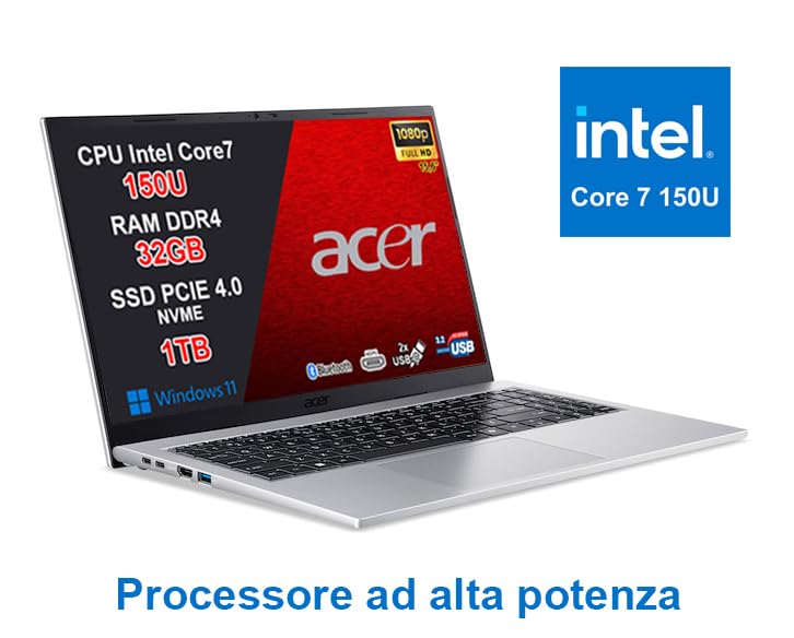 1/6acer Aspire Go 15 PC Portatile Notebook, CPU Intel Core 7 150U di nuova generazione fino a 5,4 GHz, RAM 32GB, SSD 1TB, Wi-Fi 6, Display 15,6" Full HD Antiriflesso, USB Type-C, Windows 11, Silver — Memory Speed: 3200, Processor Count: 12, Total Thunderbolt Ports: 2, Power Plug Type: type_l_3pin_it. S
