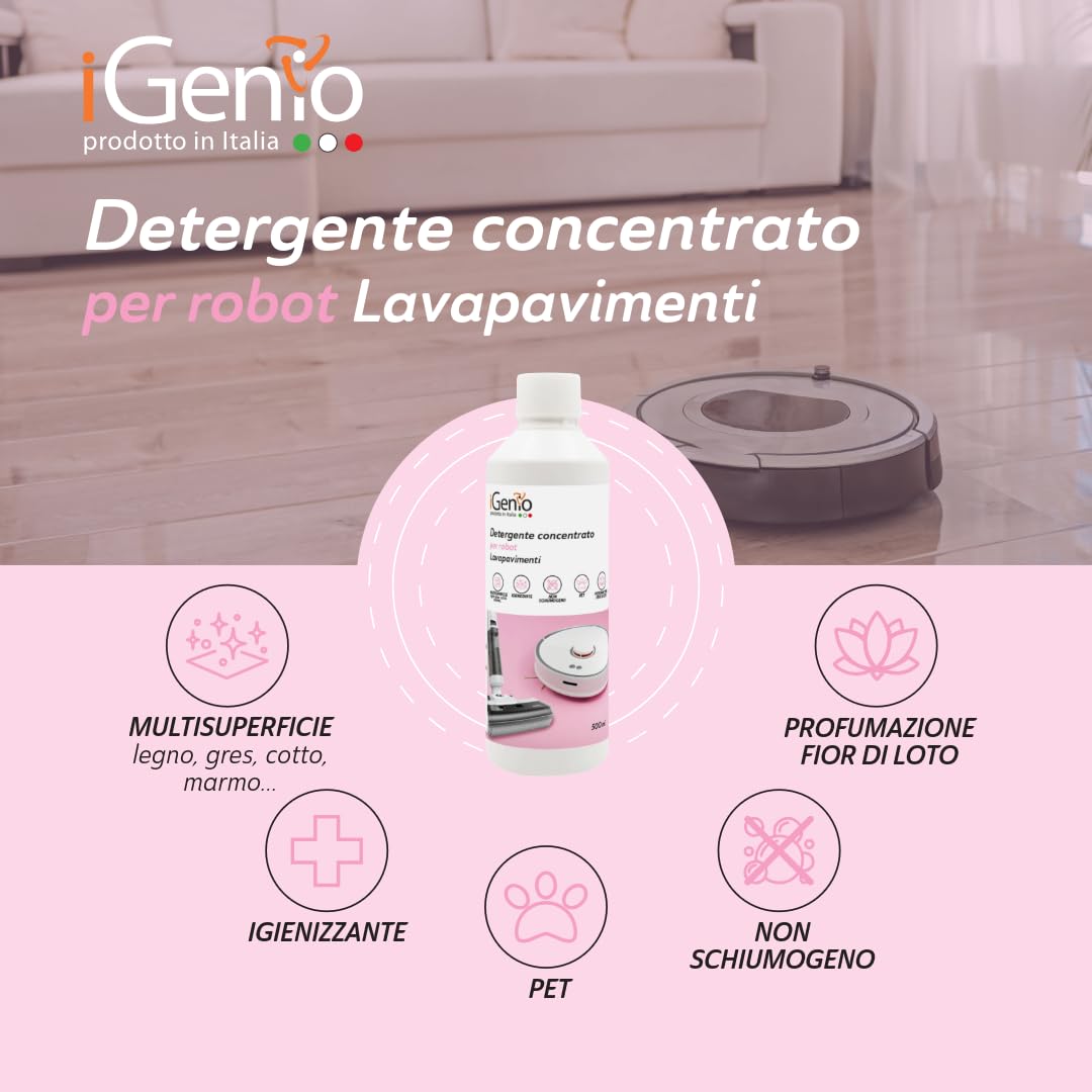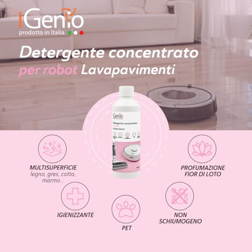 Detergente concentrato per robot lavapavimenti, 500 ml - art.996 - iGenio — Bullet Point: MULTISUPERFICIE: legno, gres, cotto, marmo…, Scent: Fior di loto, Unspsc Code: 47131800, Brand: IGENIO. Spedizione gratuita.
