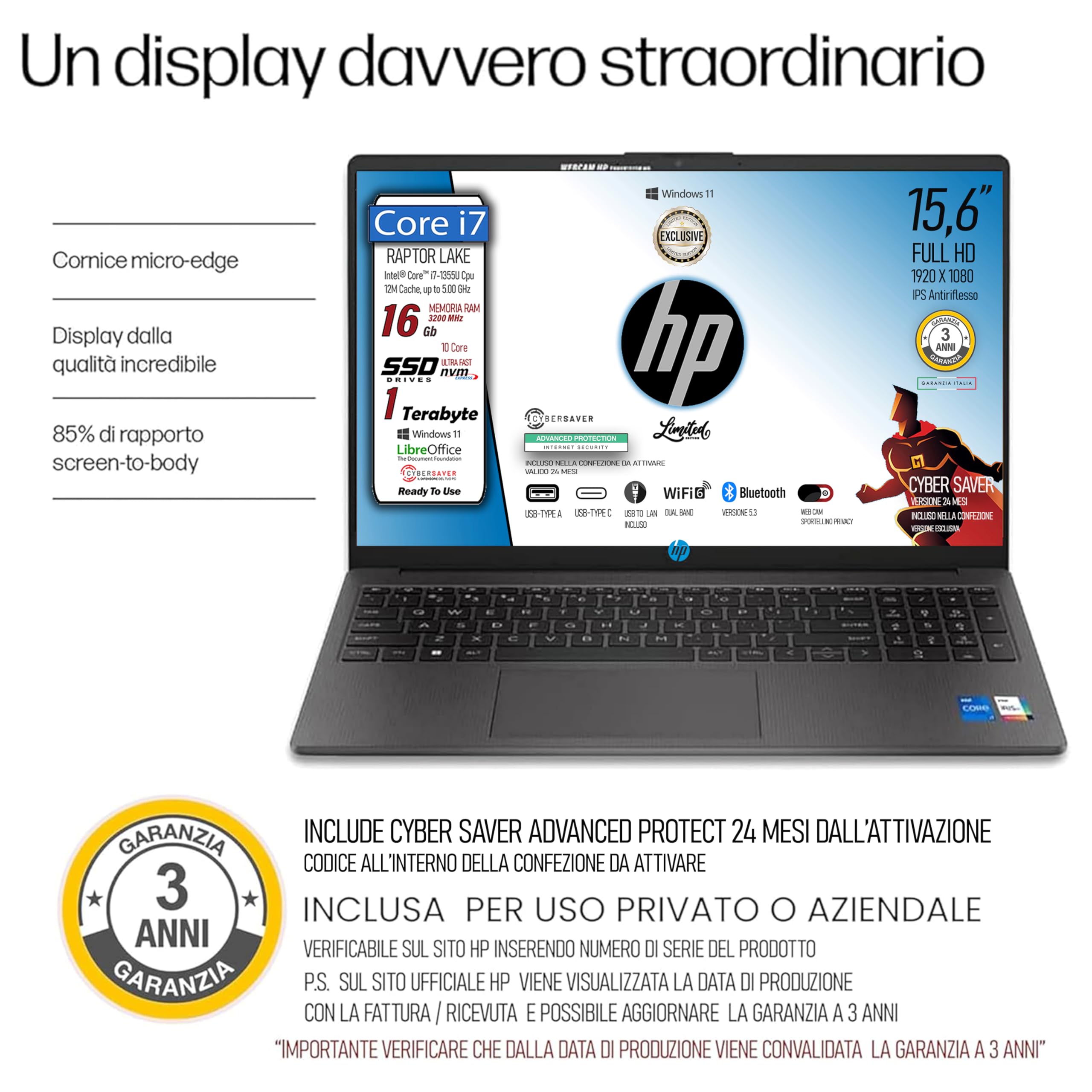HP 250 G10, Pc portatile notebook, Intel Core i7, 10 cORe, Ram 16Gb, SSD 1Tb, Display 15.6"FHD antiriflesso, Win 11, portatile pronto all'uso, Garanzia Italia 3 anni, include Cybersaver Advanced 24M