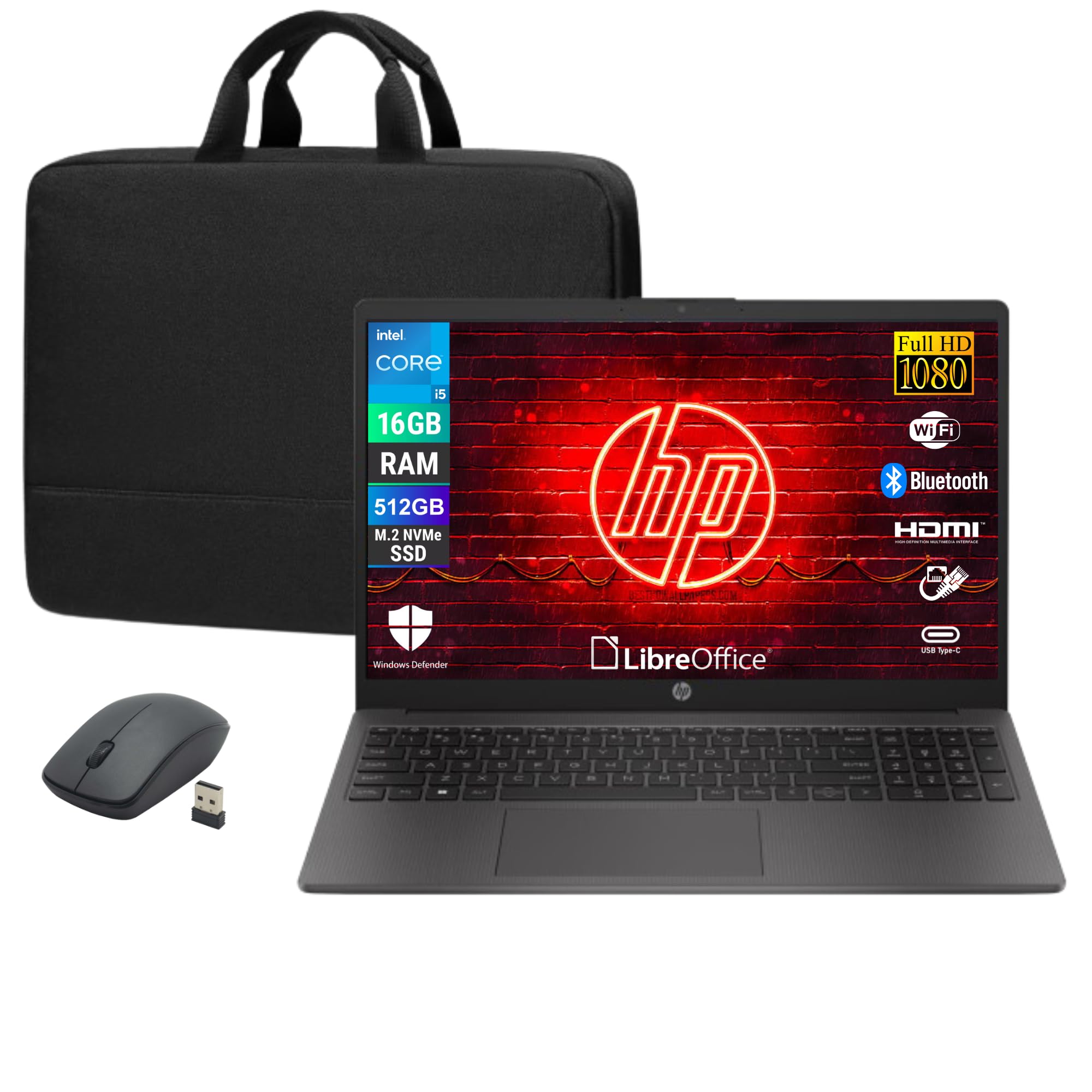 HP 250R G9, Computer Portatile Notebook, Intel 5-120u 10 Core 1.4Ghz, Display 15.6'' FHD, Ram 16GB, SSD 512GB, Windows 11, Pronto all'uso con Libre Office + Borsa e Mouse