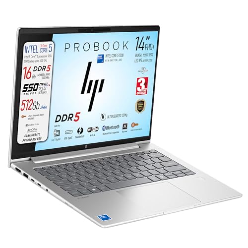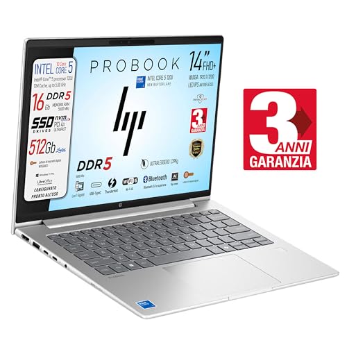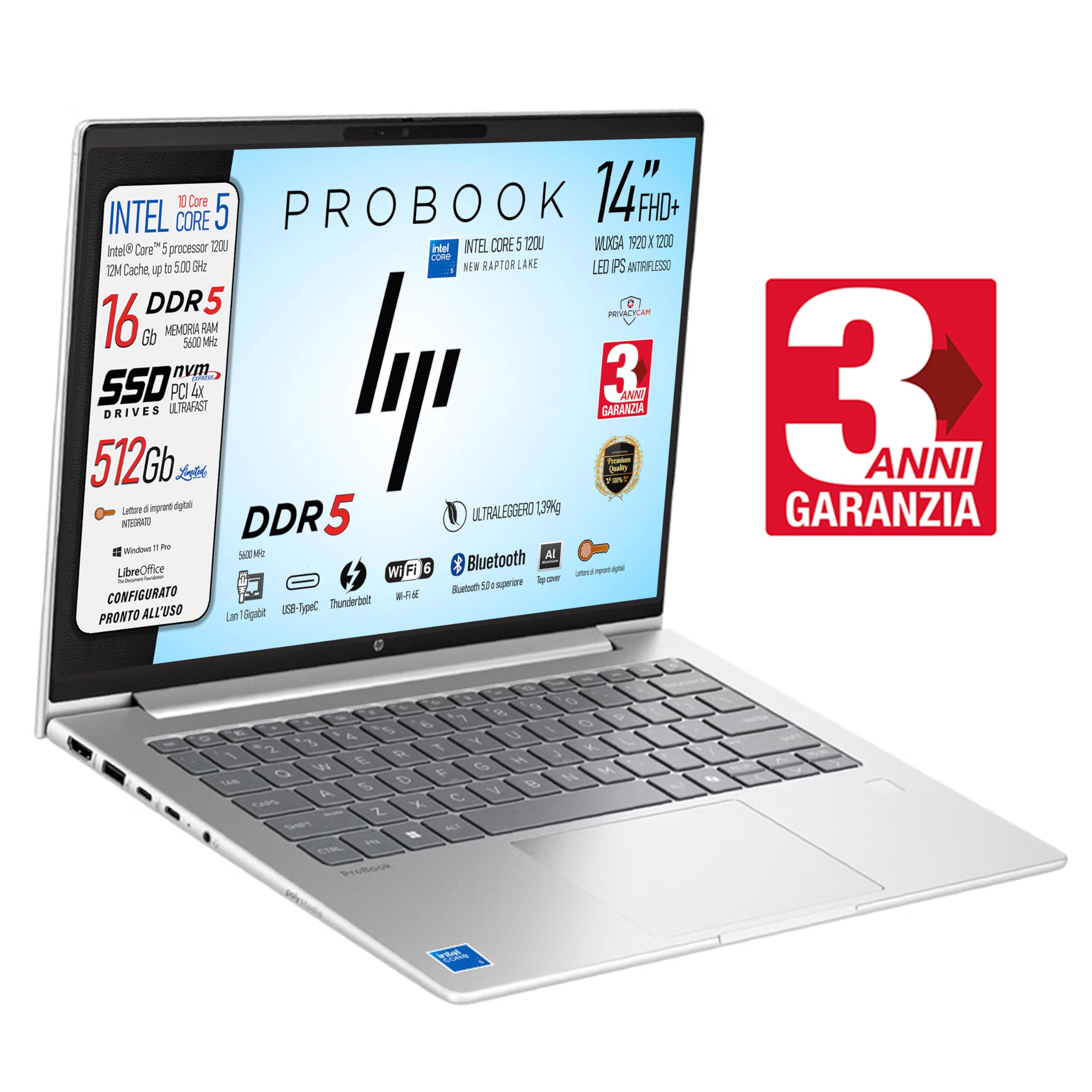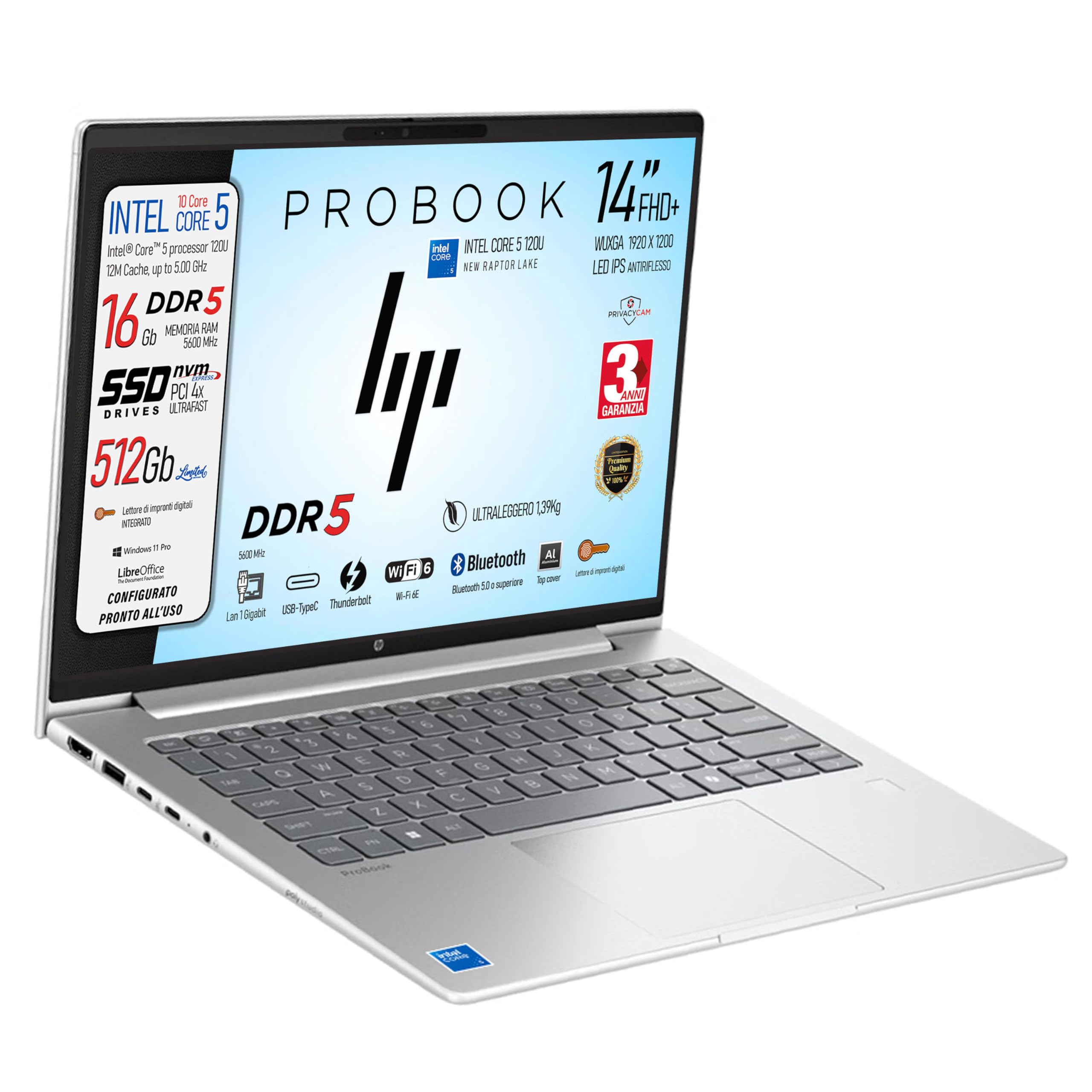 HP ProBook Notebook pc, Intel Core5 120U 10Core 5.00 GHz, SSD 512Gb, Ram DDR5 16Gb, Display 14" IPS FHD+ WUXGA, USB Type-C, Lan, Fingerprint, pronto all'uso