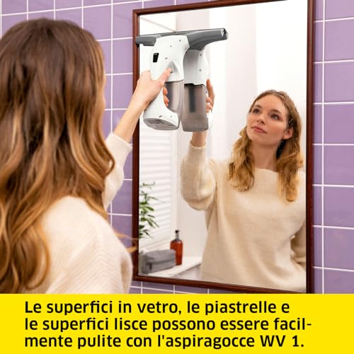 1/6Kärcher Lavavetri Aspiragocce WV 1 Plus per la Pulizia di Vetri,VERSIONE BIANCA, Specchi, Piastrelle, Doccia, Piani a Induzione, Peso: 0,5 kg, Flacone Spray e Panno Microfibra, Detergente 20 ml — Item Weight: 0.82, Hazmat: LITHIUM ION BATTERIES CONTAINED IN EQUIPMENT, Item Package Quantity: 1, Scent