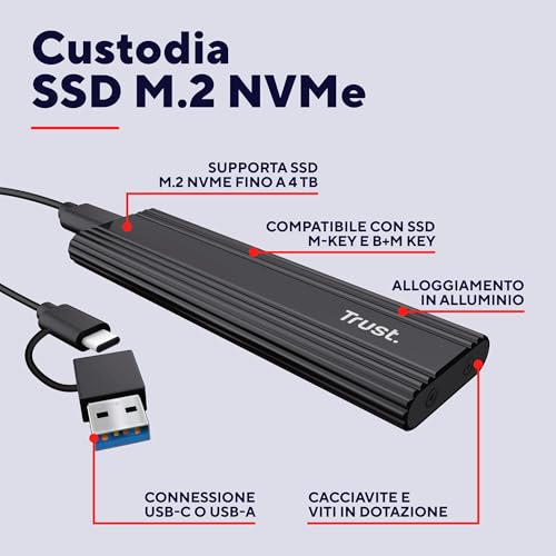 Trust Case SSD M.2 NVMe USB-C 10Gbps, Custodia Hard Disk Esterno 4TB, Compatibile con 2230 2242 2260 2280 FAT32/NTFS/EXT4/exFAT/APFS, Enclosure Portatile Adattatore SSD M2 NVMe USB M / M & B Key — Connectivity Technology: USB, Included Components: Custodia per M.2, Data Transfer Rate: 10, Language:
