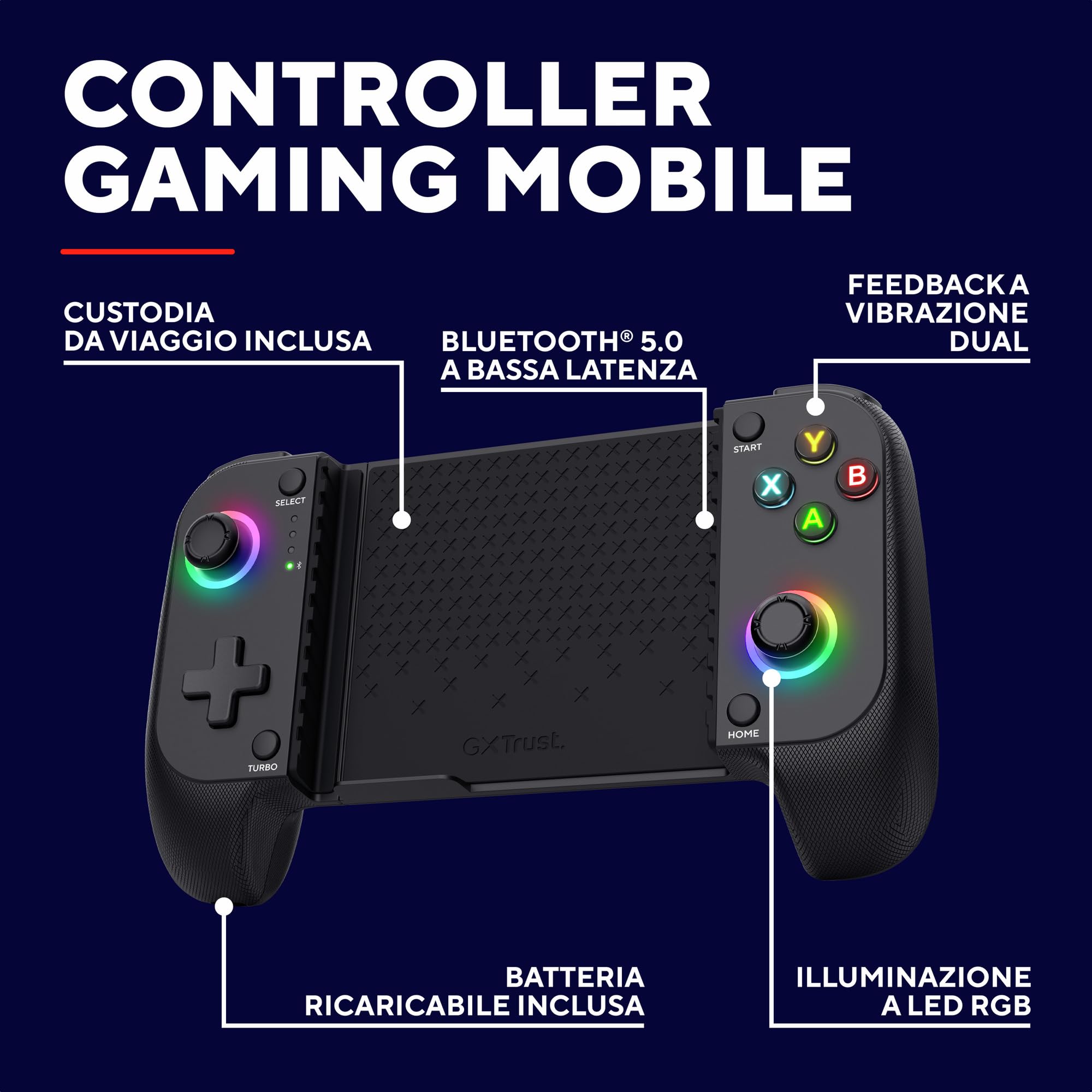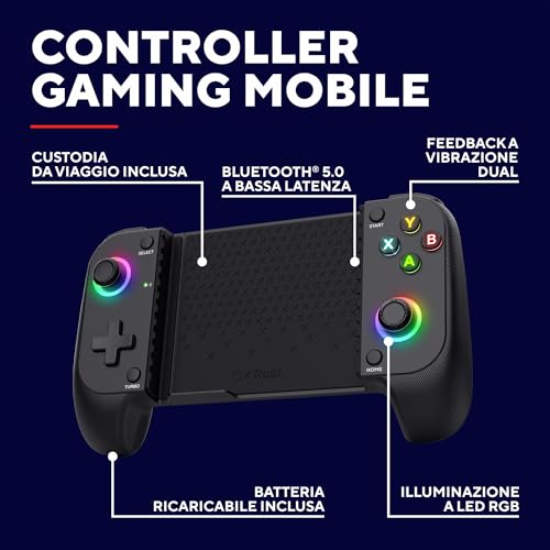 Trust GXT 735 Mylox Controller per Telefono Bluetooth, Controller Iphone / Android / PS5 / Xbox con 12h di Autonomia, Doppia Vibrazione, RGB a LED, Gamepad Wireless per Accessori Smartphone, Nero