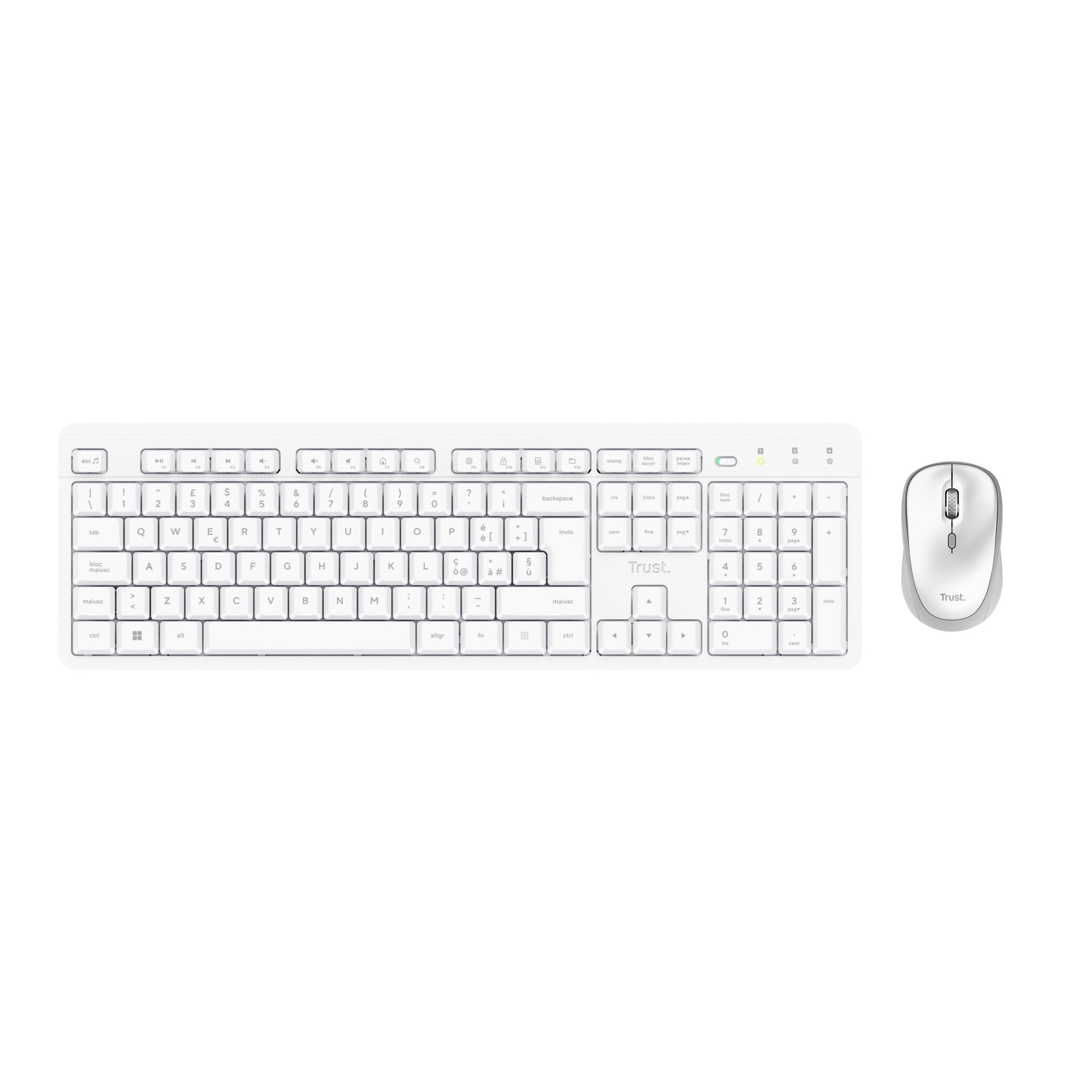 1/6Trust Ody II Set Tastiera e Mouse Wireless Silenziosi Italiano QWERTY, Tasti a Profilo Ribassato, Unico Ricevitore USB, Resistente agli Sversamenti, Kit Senza Fili per PC Laptop Mac Windows, Bianco — Connectivity Technology: Radiofrequenza, Has Multiple Battery Powered Components: true, Language: en